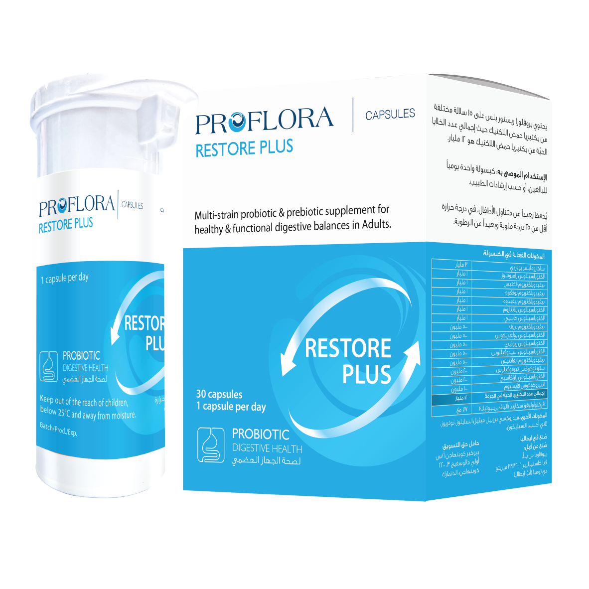 Proflora Restore Plus Adults Sachets contain 15 diverse lactic acid bacteria strains, with a total of 12 billion living lactic acid bacteria cells. These capsules contain both a prebiotic, a form of dietary fiber to feed beneficial gut bacteria, and a multi-strain probiotic, live microorganisms with potential health benefits when consumed. This contributes to a healthier digestive system by allowing gut bacteria to provide nutrients for colon cells.